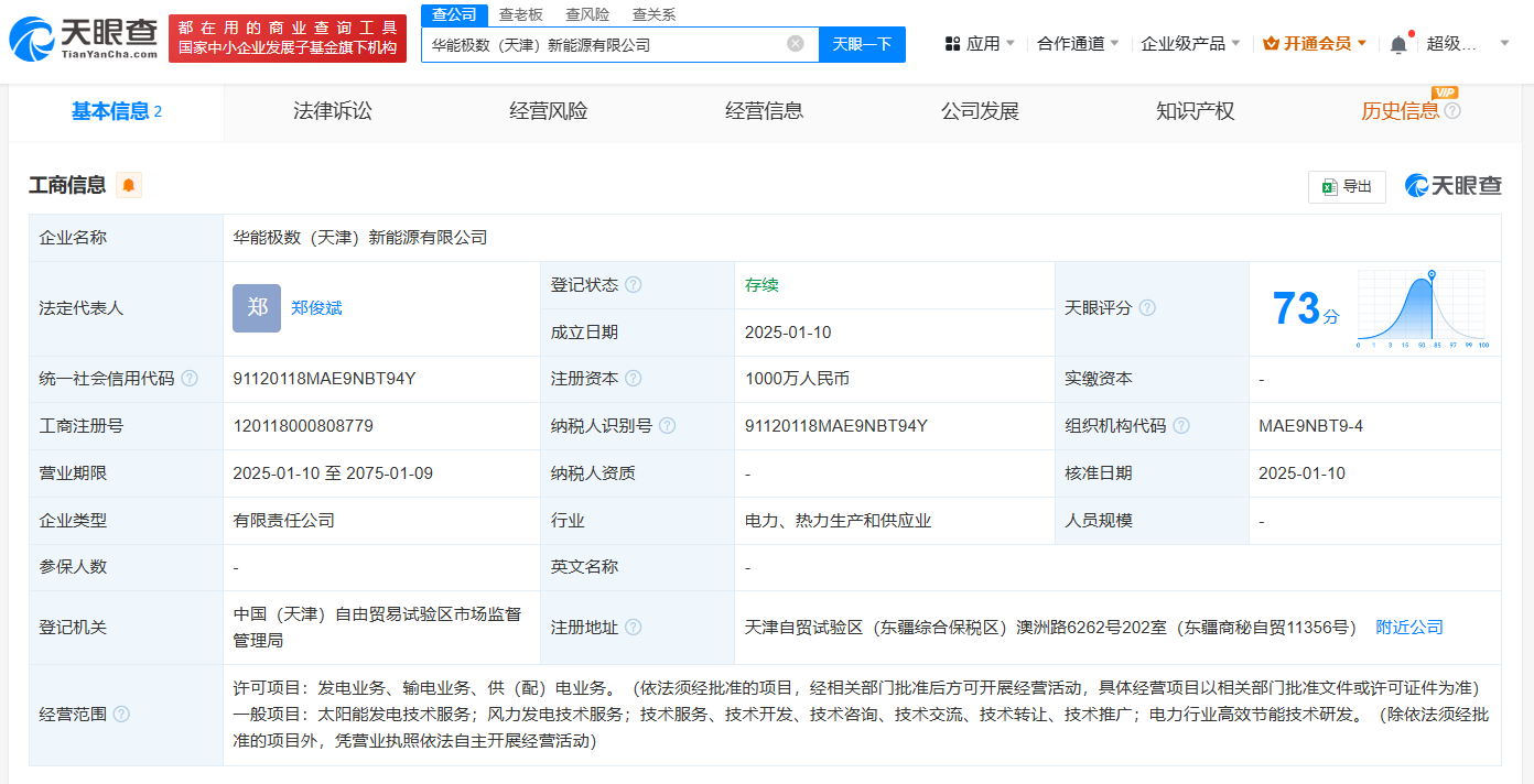 华能新能源极数能源在天津成立新公司 注册资本1000万元
